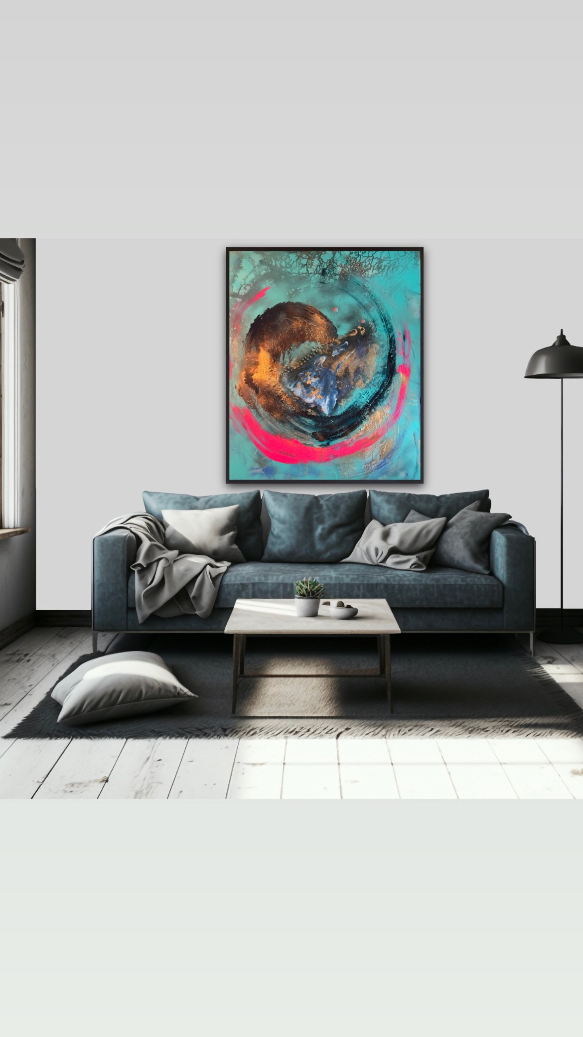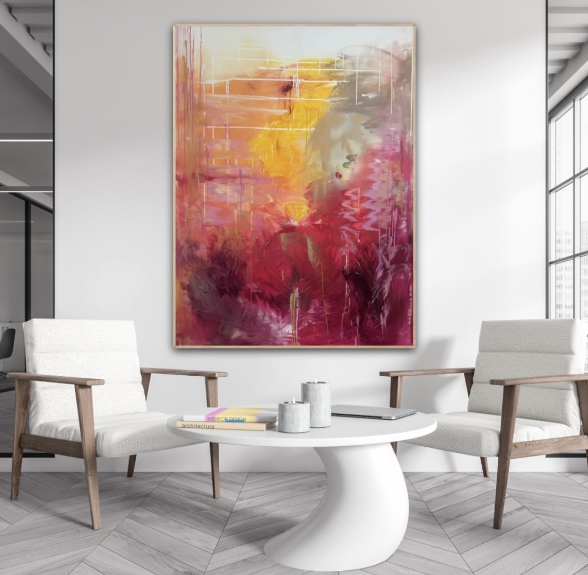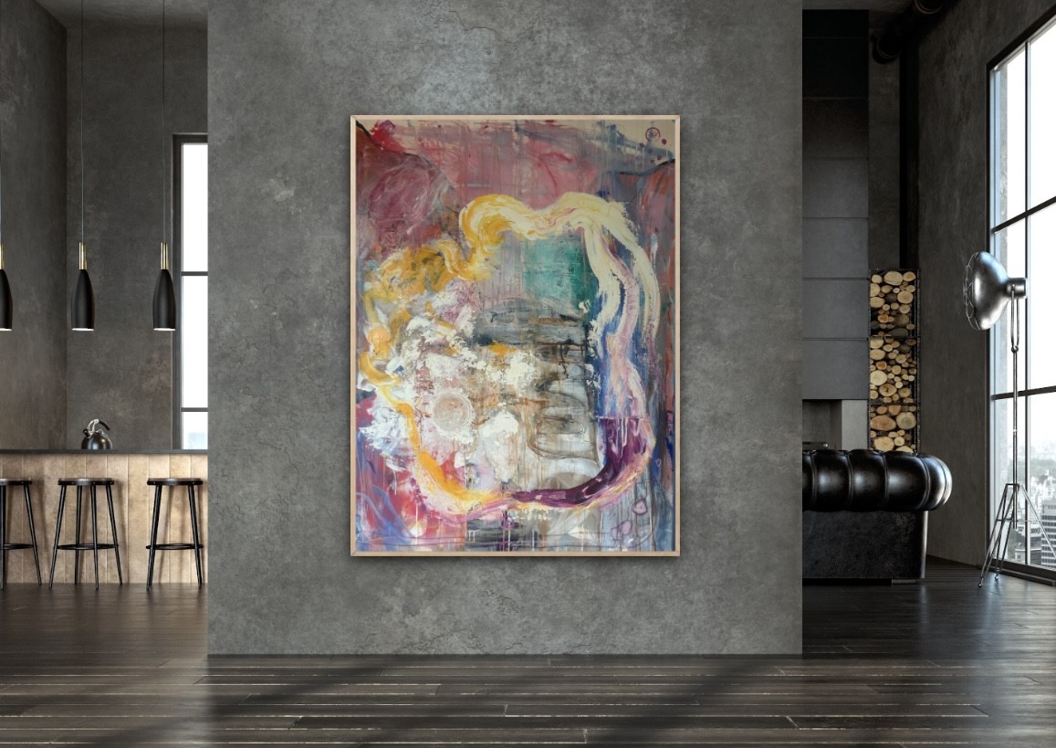 Mitt uttryck är dynamiskt och jag målar oftast i stora format i härliga färger. Akryl och inslag av olika medium skapar en livfull känsla.